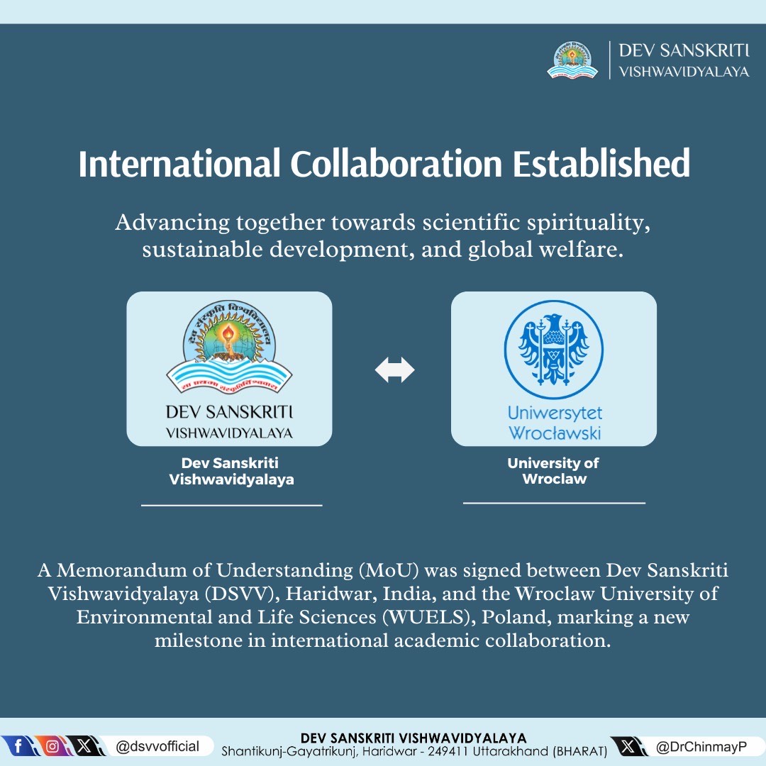 In a remarkable step toward strengthening international academic cooperation and promoting the integration of science, sustainability, and spirituality, Dev Sanskriti Vishwavidyalaya (DSVV), Haridwar, has signed a Memorandum of Understanding (MoU) with the Wroclaw University of Environmental and Life Sciences (WUELS), Poland.